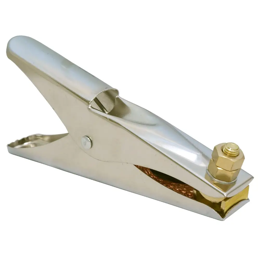 Заземляющий зажим. Основными требованиями к зажимам заземления являются: допустимый сварочный ток и обеспечение плотного контакта между деталью и контактными губками. Контактные поверхности (губки) представляют собой вставки из технической меди, соединенные медной сеткой “косичкой”.