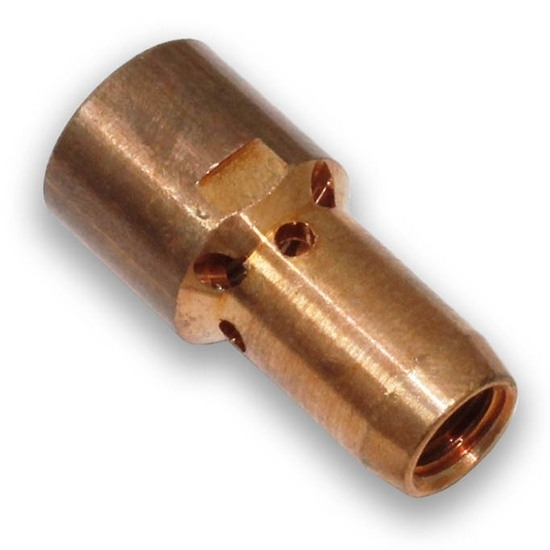 Адаптер контактного наконечника (вставка наконечника) M8, для горелок PSF ESAB, гарантирует надежную фиксацию токосъемного наконечника в сопле горелки. Отверстия обеспечивают равномерное распределение газа в сопле, выполняя функции диффузора.